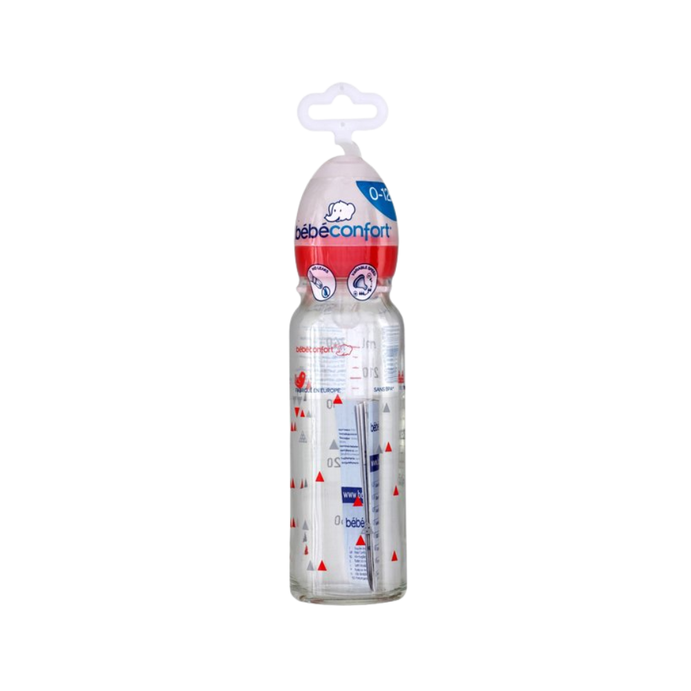 Le biberon droit Bébé Confort 240 ml Sport combine la sécurité du verre résistant à la chaleur et une forme simple à utiliser au quotidien (remplissage, nettoyage et prise en main).