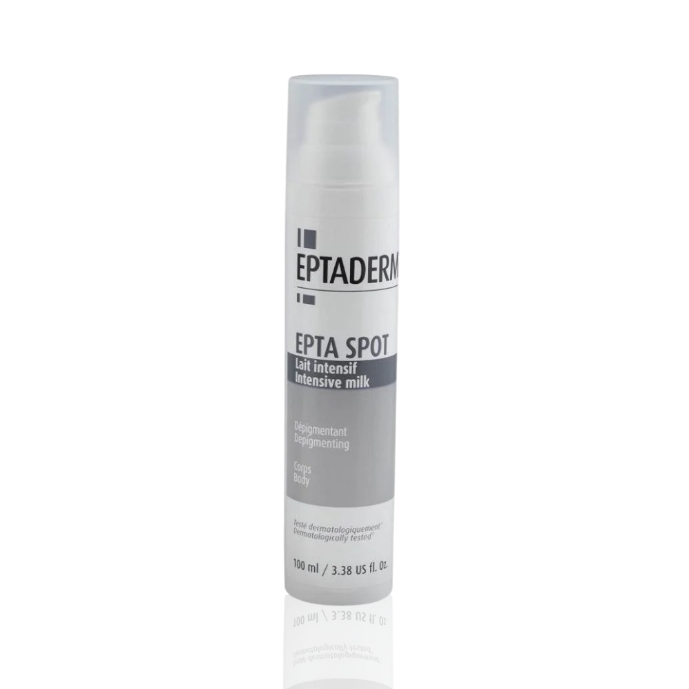 Le Epta Spot Lait Dépigmentant Intensif est un soin quotidien conçu pour cibler les zones hyperpigmentées, en particulier sur le visage ou les zones corporelles concernées. Il associe des actifs éclaircissants et hydratants pour :