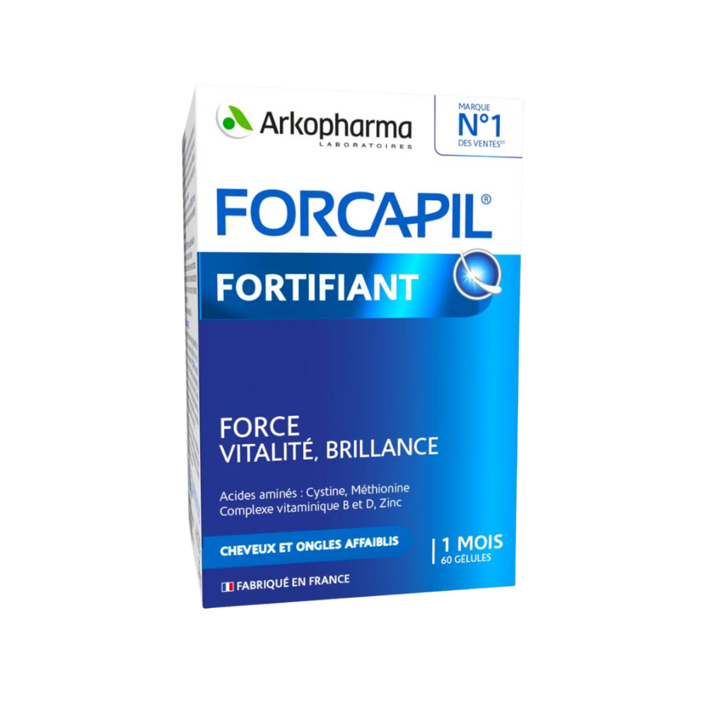 Complément alimentaire diététique destiné aux personnes souhaitant favoriser la croissance des cheveux et des ongles et renforcer leur vitalité. Grâce à un complexe vitaminique B, vitamine D, cystine, méthionine, biotine et zinc, Forcapil favorise la croissance des cheveux, suite à une chute ponctuelle due au stress et à la fatigue, au déséquilibre alimentaire, aux carences en vitamines, à l’excès de sébum… Il redonne vitalité et brillance à votre chevelure et fortifie vos ongles.
